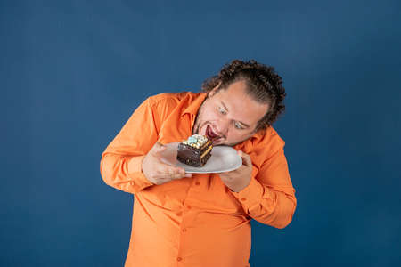 Funny fat man in orange shirt with a piece of chocolate cake on a plate. Birthday celebration