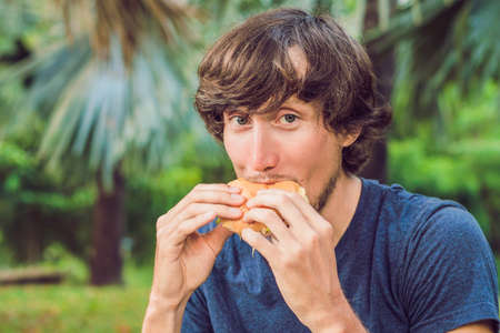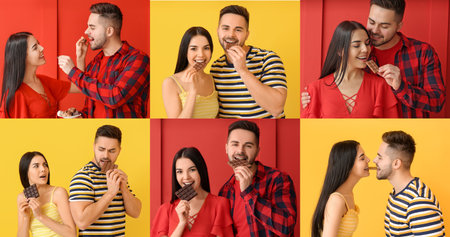 Young man and a woman are eating sandwich with red and black caviar from two sides. Luxury life concept.