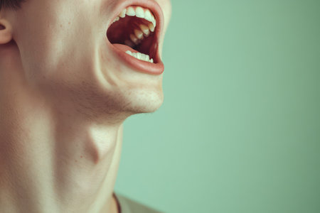 Close-up of man yelling with mouth wide open, visible teeth and tension, expressing anger or intense emotion against green background.