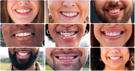 Dental, diversity and smile with collage of people in city for happy, pride and teeth cleaning. Mouth, wellness and oral hygiene with closeup of lips with facial expression for confidence and braces