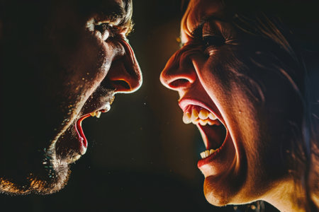 Close-up of man and woman screaming at each other in an intense argument. Bad emotions and conflict in relationships. Home abusing