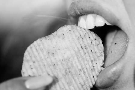 Dental Care. Closeup girl mouth with pleasure eats potato chips.