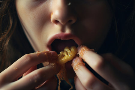 Close-up pictures of an Asian woman enjoying her eating.Focus on mouth