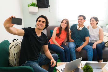 Let's remember this moment. Happy college friends taking a break from doing homework and taking a selfie with a smartphone while sitting on the couch