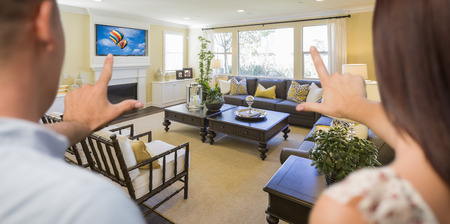 Young Couple Framing Their Hands of Beautiful Home Interior Living Room.