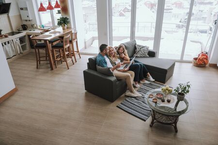 Happy family sitting on couch and watching videos on laptop