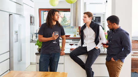 Group of men as friends talk to each other while drinking wine on celebration in kitchen