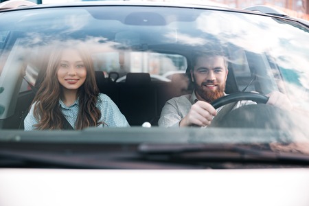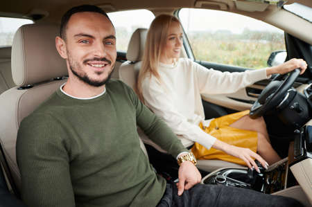Portrait of smiling man in interior of automobile. Bearded guy travelling by vehicle with beautiful female blonde who driving auto. Young couple people with happy face expression riding in elite car.