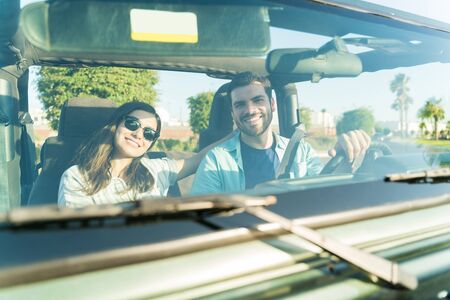 Portrait of Hispanic lovers spending leisure time in SUV during trip