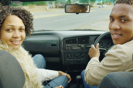 Smiling young man and girlfriend sitting in a car enjoying each other's company on a sunny day