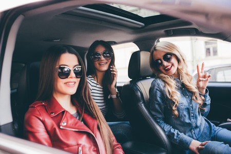 Three beautiful young women friends have fun in the o car as they go on a trip