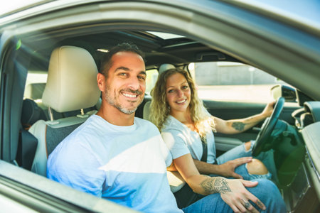 Enjoying Travel. Young couple sitting in brand new car, testing their new rental transport