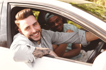 White young models men talking sitting in the car