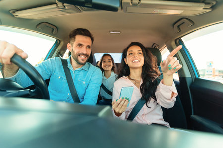 This way. Happy european family sitting inside car, woman pointing at the road showing way, view from auto dashboard