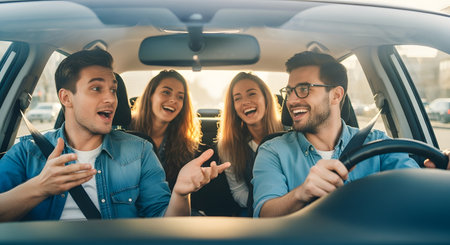 A group of four joyful friends laughs while traveling in a car during a road trip. The driver and passengers engage in lively conversation enjoying their journey together.