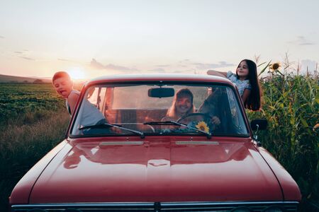 Happy playful family traveling together by the car, beautiful young mom driving and her children got out the car windows and having fun, sunset on the background