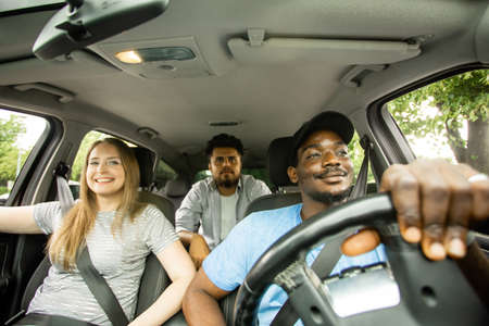 Happy young international friends riding their car, looking through windows, going on road trip together