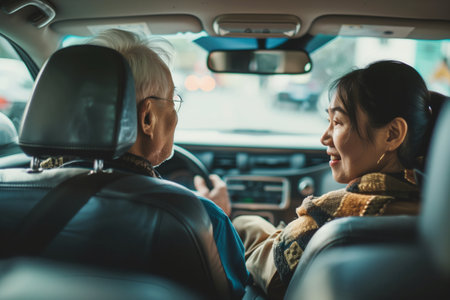 Grandfather and his granddaughter are riding in car. Senior male driver and female passenger in city traffic on busy day