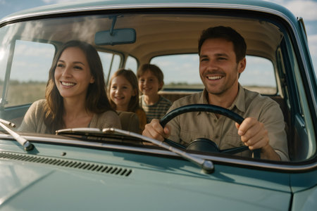 Smiling family enjoying a joyful road trip in a vintage car, creating lasting memories together during their summer adventure