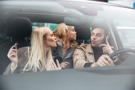 Three young cheerful women looking at pointed hand direction with smile while sitting in car