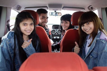 Family in car together, taking road trip