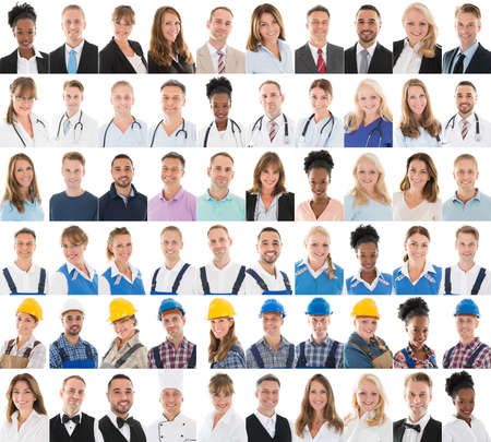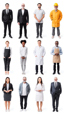 Full length portraits of a group of people of diverse different professions of business, medicine, construction industry on white