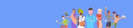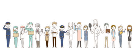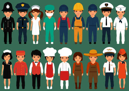 Collection of men and women people workers of various different occupations or profession wearing professional uniform set. Doctor, stewardess, builder, photographer, business woman, police officer