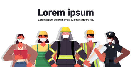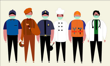 illustration of some workers wearing masks, police, artists, teachers, doctors, cooks, couriers, etc. wearing masks.