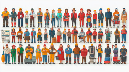 A diverse group of professionals pose outdoors against a cityscape, showcasing various occupations. The image presents a collaborative atmosphere, with the subjects in professional attire and work wear. Bright sunlight illuminates the scene, creating a sense of unity, ideal for representing careers and teamwork. Suitable for editorial and commercial use.