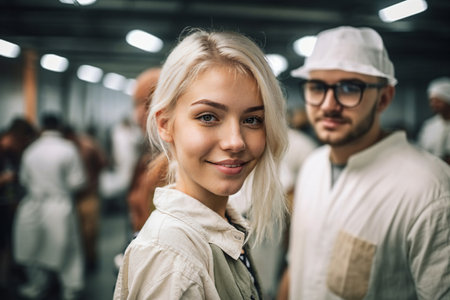 Photo of a diverse group of factory workers in pastel-colored uniforms, standing together in front of assembly lines, with space for text, captured with a 35mm lens at f/2.0, --ar 16:9 Job ID: 8418abd6-b2b8-49ba-b9bf-58ea6326ca9e