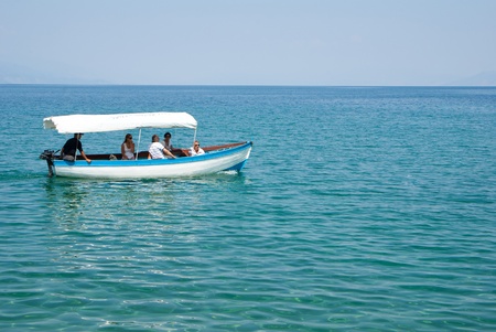 People sail on a white motor yacht in the open sea on a bright sunny day