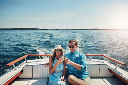 Welcome to a life of luxury. a young couple having champagne on a boat ride.