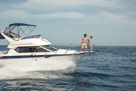 Young clerk in casual office clothes made surprise for his girlfriend, he hired motorboat yacht which provides them with a peaceful atmosphere and privacy sailing in open sea, far from city noice