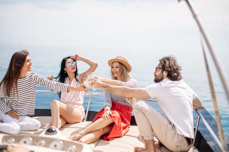 Young european tourists guys and girls celebrating on yacht happy start of their vacation - Group of friends toasting drinks and having party on a sailing boat.