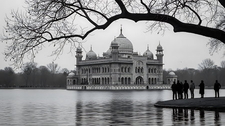 A group of people stand by a lake with a stunning building in the background during ramadhan