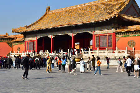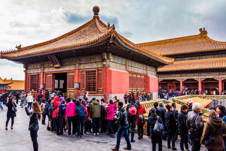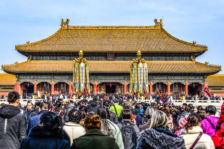 Beijing, China April 2013 Crowd of tourists visiting Forbidden City and taking pictures, front view on temples with golden roofs