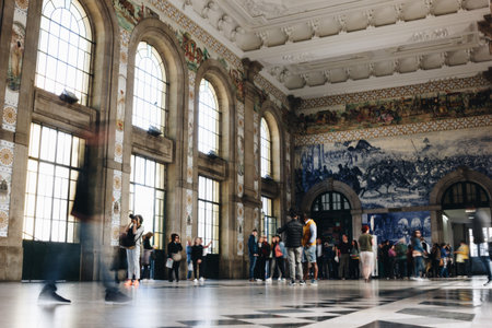 PORTO, PORTUGAL - APRIL 30, 2016: Painted ceramic tileworks (Azulejos) on the walls of Main hall of Sao Bento Railway Station in Porto