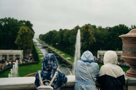 Peterhof, Russia: August, 2021 - the palace park. Tourists visiting the landmark of St. Petersburg. High quality photo
