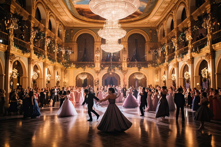 A vibrant and ballroom filled with elegantly dressed people engaged in dancing. The scene is set within a grand historic hall featuring crystal chandeliers, ornate gilded decorations, and richly painted ceilings. Tall windows draped with deep red curtains allow light to filter in, illuminating the polished marble floor where couples twirl. The atmosphere is one of celebration and romantic festivity, showcasing a blend of historical grandeur and social elegance.