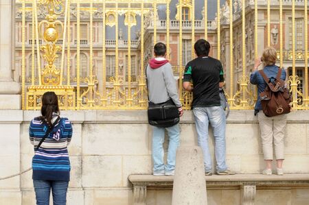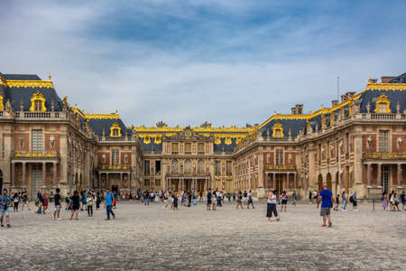 Versailles, France - August 27, 2019 : People visiting the Palace of Versailles, a royal chateau in Versailles, France. Marble Court. It was added to the UNESCO World Heritage List.