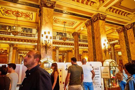 Monte Carlo, Monaco - September 17, 2016: A view of the lobby of the Casino de Monte-Carlo. Beautiful interior of the casino in Monaco with marble and gold decoration and tourists in it