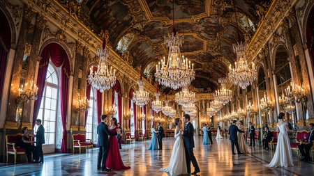 An opulent ballroom is filled with elegantly dressed individuals in 18th-century attire, engaged in a graceful dance. Ornate gold detailing adorns the walls and ceilings, complemented by sparkling crystal chandeliers. Musicians play classical instruments, adding to the atmosphere of this grand historical gathering. The scene evokes a sense of luxury, romance, and entertainment.