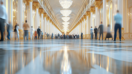 Grand palace hallway with golden chandeliers, marble floors, and people walking in the distance. Luxury architecture and royal interior