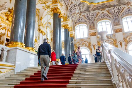 St. Petersburg, Russia - June 26, 2019: Tourists walk up the steps of the Jordan staircase in the Winter palace (State Hermitage Museum) in St. Petersburg, Russia