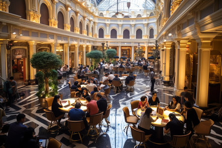 captures a ballroom filled with elegantly dressed figures in historical period attire, engaged in conversation and socializing. The room is a masterpiece of opulent featuring extensive gilded ornamentation, intricate wall panels, and lush green velvet drapes. Multiple crystal chandeliers cast a light across the polished marble floor and the ceiling, which is adorned with a detailed fresco. The space is furnished with classic seating arrangements and small tables, creating an atmosphere of...