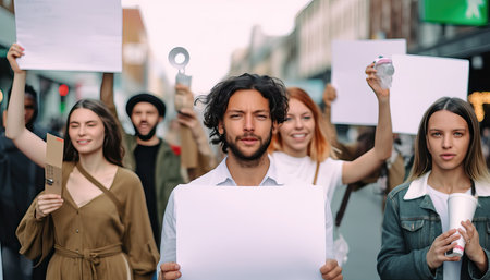 Angry diverse group of young activists holding blank signs and shouting during a political protest demonstration