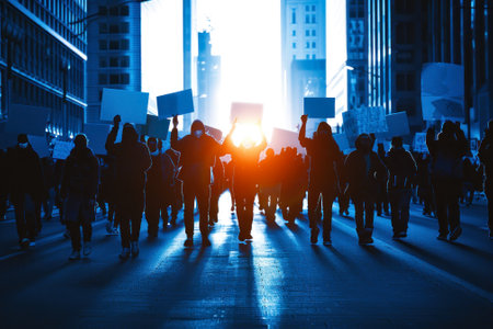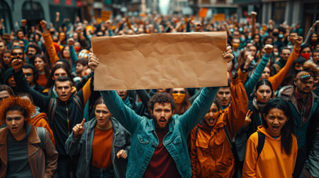 A diverse crowd gathers in the city, raising banners and voices during a dynamic protest march, reflecting unity and activism.