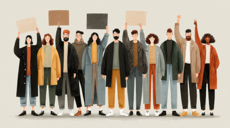 Activists from all walks of life come together in solidarity, lifting high their demand signs to advocate for change. The image embodies the spirit of activism, collaboration, and the fight for a better future. illustration created by Generative AI