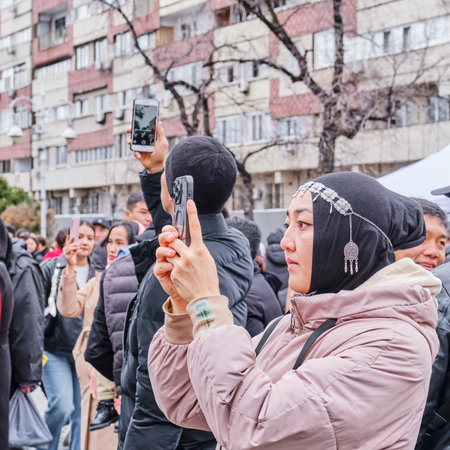 Almaty, Kazakhstan - March 21, 2024: Cute Kazakh girl wearing traditional hijab and ethnic metal head decoration, films concert on her phone in crowd during celebration of spring holiday of Nowruz