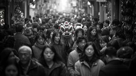 A lot of Asian people on the street of a big city, blurry photo. Background to illustrate the demographic crisis and overpopulation on the planet Earth.